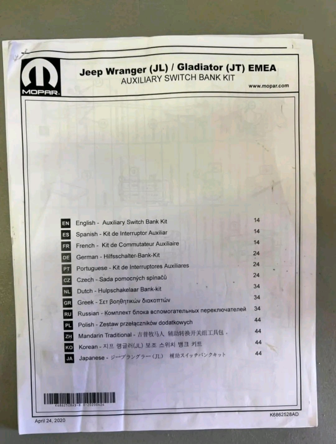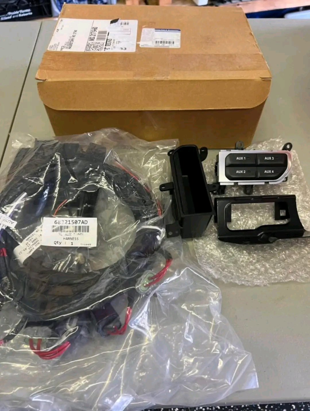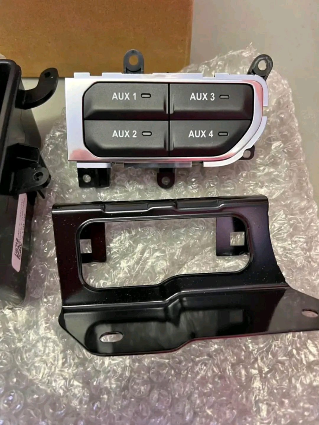 Brand new never installed. Genuine Mopar, Jeep Wrangler and gladiator auxiliary switch kit. Fit model years 2018 through 2025. Auxiliary Switch Bank kit includes Silver switch bank trim, switches, power distribution center (PDC), bracket, wiring harness, cubby bin, tie straps and splice kit.